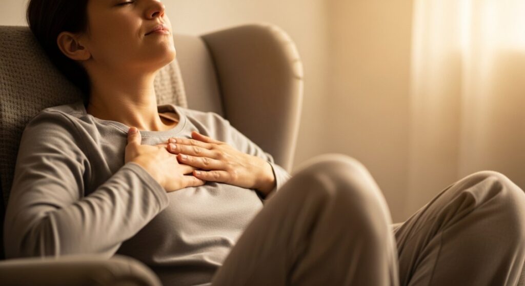 بعد 5 دقائق من هذا التمرين، ستشعر بتنميل خفيف وإحساس بالثقل… وهذه علامة ممتازة على أن جسمك دخل مرحلة السكون.